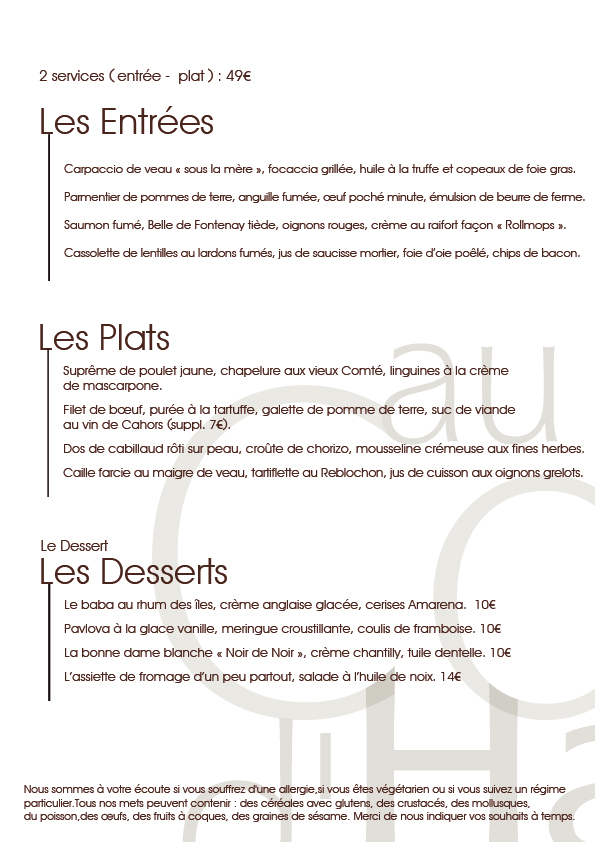 Depuis de nombreuses années, nous proposons une carte et des menus orientés sur la cuisine française, avec parfois des influences asiatiques ou même méditerranéennes au gré de l’inspiration de notre chef.