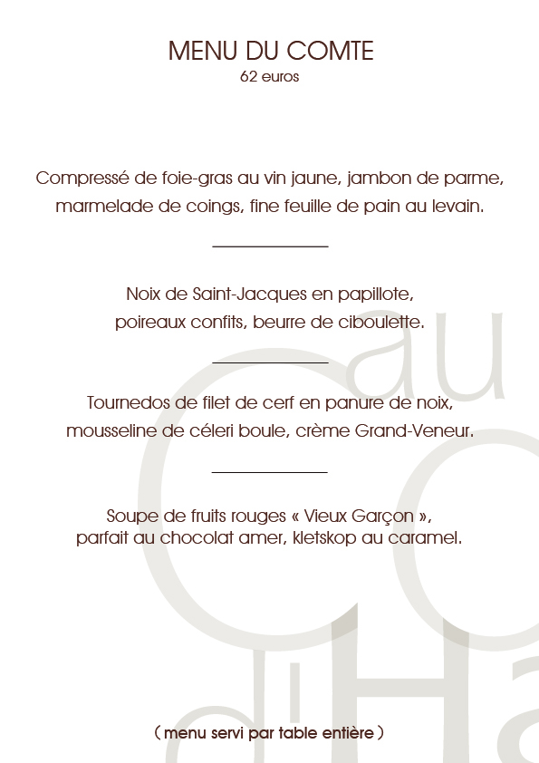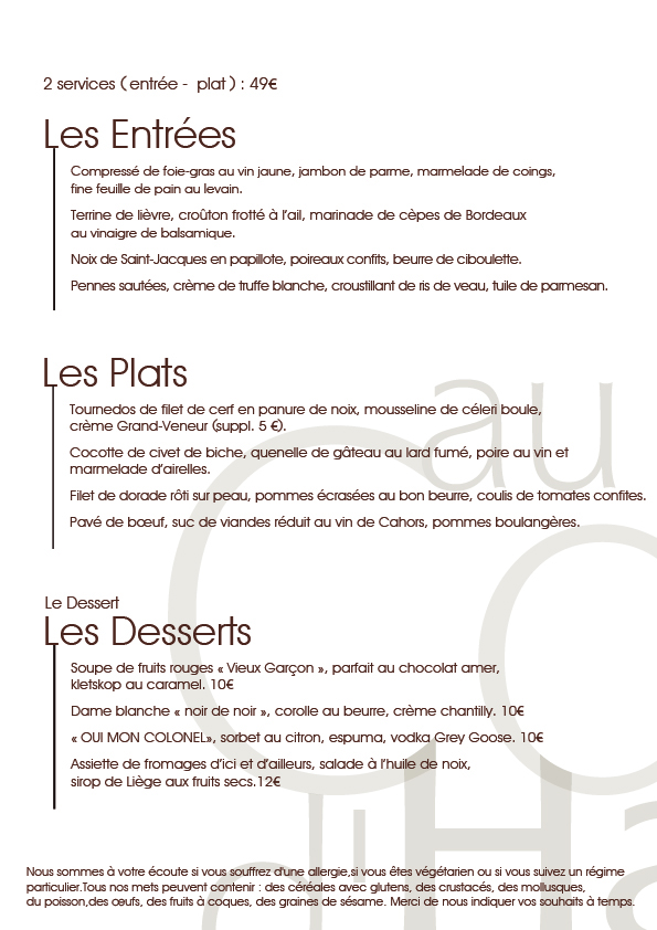 Depuis de nombreuses années, nous proposons une carte et des menus orientés sur la cuisine française, avec parfois des influences asiatiques ou même méditerranéennes au gré de l’inspiration de notre chef.